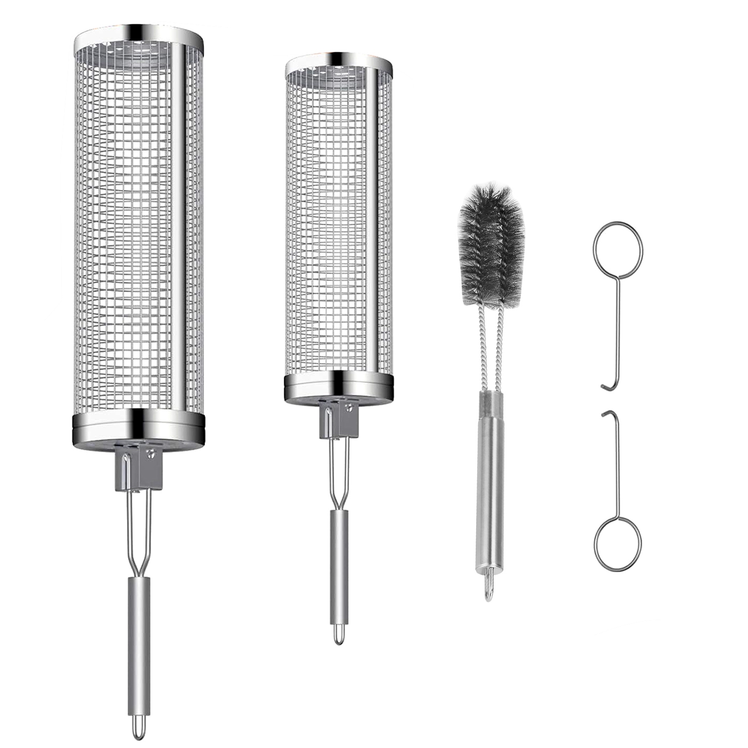 Looking for portable grilling accessories for outdoor grill Try these BBQ net tubes Made of rustresistant 304 stainless steel our rolling grill baskets can not only can withstand the heat of the grill but also rotate 360 degrees to ensure that food is evenly heated Features firm lids to secure food portable handles to rolling the basket and convenient hooks to securely lock or unlock the baskets Dishwasher safe and easy to clean with the included cleaning brush Perfect charcoal grill accessories to cook food such as asparagus string beans spinach kale brussel sprouts french fries meatballs salmon and even fruits Comes with 2 different size Grill more food in less space at the same timeNesting Design Designed with nesting structure these round grill baskets can not only rotate 360 degrees to ensure that food is evenly heated but also grill more food in less space at the same time Comes in 2 sizes Perfect charcoal grill accessories to cook food such as asparagus string beans spinach kale brussel sprouts french fries meatballs salmon and even fruitsSecure Locking Mechanism Our grilling baskets come with a sturdy lid that secures food guaranteeing even cooking and averting barbecue accidents Say goodbye to the irritation caused by baskets opening while cookingPortable Handles Hooks Our BBQ net tubes for grilling feature 2 portable handles on top of the lid which allow you to roll the basket with ease while youre busy at grilling Our rolling grill baskets also provide 2 hooks to ensure that you can securely lock and unlock the baskets simplifying the process of adding flipping and removing your grilled itemsDurable Sturdy Constructed out of rustresistant 304 stainless steel these grill vegetable baskets can withstand the heat of the grill and maintain its original shape A reliable assistant for your outdoor grilling partyEasy To Clean Dishwasher safe With the included cleaning brush you can easily scrub and rinse our stainless steel barbecue grill grates in your sink Really help save your time and energy after a busy and messy barbecue partyProduct Type Nesting Grill BasketMaterial 304 Stainless SteelPer Hook Length 12cm472inPer Handle Length 21cm827inBrush Length 32cm126inBig Grill Basket Size 959533cm3743741299inBig Grill Basket Weight 173g038 lbsSmall Grill Basket Size 858525cm335335984inSmall Grill Basket Weight 143g032 lbsPackage Size 351010cm1377393393inPackage Weight 658g145lbs1x Big Grill Basket1x Small Nesting Grill Basket2x Handles2x Hooks1x Cleaning Brush