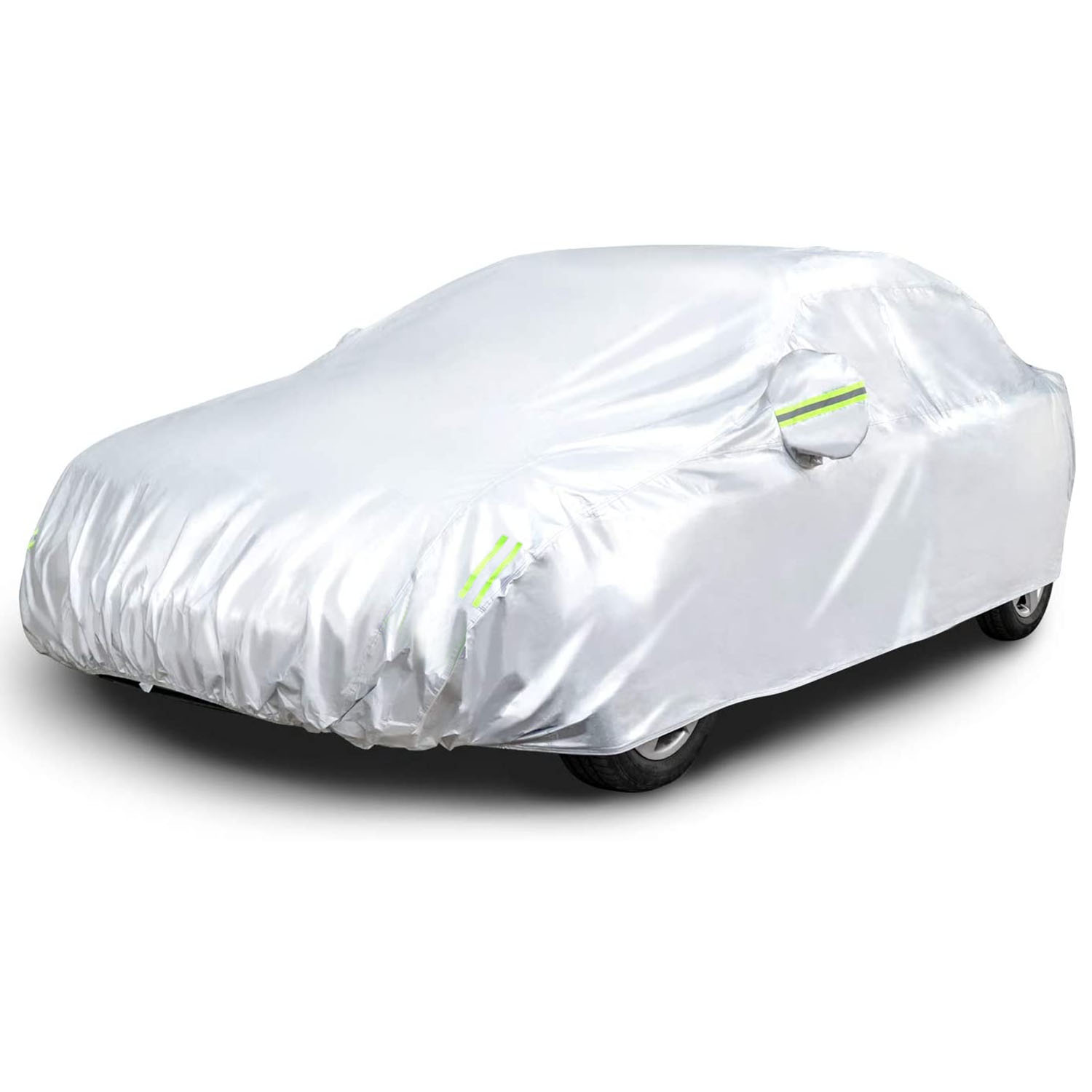 Full Coverage Car Cover Waterproof UV Protection Automotive Cover Outdoor Universal Car Cover with Reflective Strips Installation Straps Buckle-Silver