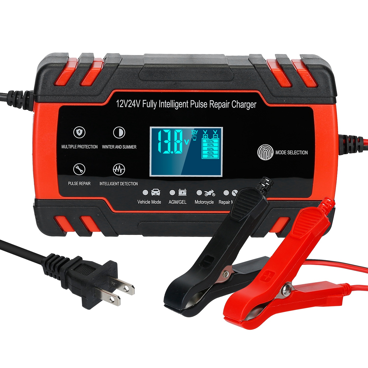 Our 12V24V car battery charger can automatically monitor the whole charging process of most type of 12V 4Ah100Ah and 24V 4Ah80Ah leadacid batteries including AGM GEL flooded Wet calcium type deep cycle and EFB etc And it can enter into pulse repair function to restore loss batteries when you choose the Repair mode This battery charger is not only excellent for cars motorcycles ATV RV and boats but also suitable for riding toys golf carts lawn mowers and more equipment Latest Intelligent Chip Control Portable battery charger automatically adjusts the charge current and maintainability according to the temperature Automatic detection of ambient temperature so that winter can be full speed summer is not overload Battery Repair Function Builtin advanced battery REPAIR mode to help to recover oldidle batteries and extend battery life The highfrequency and lowfrequency pulse technology has good repairing and activation effects Note It cant activate a dead battery or repair a battery that is damaged seriously Multiple Safety Protection Builtin circuit protection our automatic smart battery charger guards against short circuit overcurrent overheat fire low voltage over voltage reverse connection and electric shock Clear LCD Screen Display The charging data is automatically updated on the screen and temperaturecurrentvoltageelectricitysummer modewinter mode can be displayed You can check the charging status of the battery at any time Wide Applications Small and compact design easy to storage and carry It is not only excellent for cars motorcycles ATV RV UTV and ships but also suitable for riding toys lawn mowers and more equipment Note Do not charge for LITHIUM BATTERIESRed clamp for positive pole black clamp for negative poleBrand Fresh Fab FindsProduct Type Car Battery ChargerMaterial ABSDisplay Screen Diagonal 42cm165inBattery Type Most Lead Acid Batteries AGM Gel EFB etcInput Voltage 100240v 5060HzOutput Current 12V8A 24V4AMin Start Voltage 20VBattery Range 12V 4150AH 24V 480AH Heat Protection 655149F41FCooling FanOperating Humidity Range 90 RH MaxOutput Line Length 52cm2047inInput Line Length 102cm401inItem Size 165x9x55cm65x354x216inItem Weight 588g13lbsPackage Size 28x17x7cm1102x669x276inPackage Weight 683g151lbs1x Car Battery Charger1x User Manual