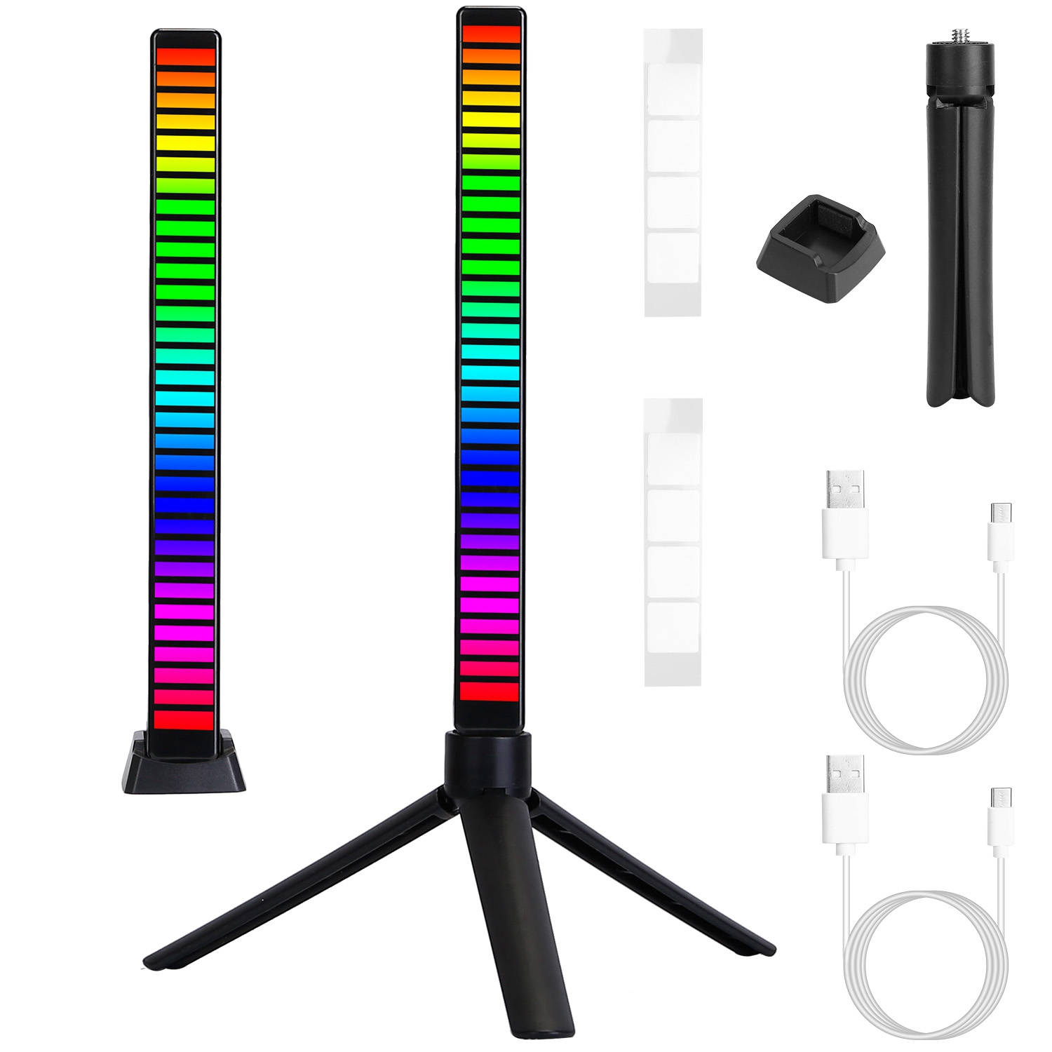 Our LED RGB sound control light bar is a good helper to create fantastic atmosphere no matter in your car family or friends gatherings Designed with 3D curved surface and builtin 32 LEDs make the light jump briskly with the rhythm allowing you to enjoy the dynamic beauty in all directions Simply adjust lighting modes with button or via APP on your phones 9 Lighting directions various color combinations lighting speed and voice sensitivity can be adjusted as you want to customize your unique light modes Upgraded 3D Curved Surface Designed with upgraded 3D Curved surface allows you to enjoy the dynamic beauty in all directions giving you more wonderful visual feast compared with traditional soundcontrolled lights Dance With Rhythm Built in highsensitive microphone with noise reduction function and designed with 32 LEDs the colorful light will jump briskly with the rhythm definitely creating a fantastic pleasant and wonderful atmosphere APP Button Control This sound control light can use the button or APP on your phone to change the light mode 9 Lighting directions lots of various color combinations lighting speed and voice sensitivity can be adjusted via the APP Easily customize the light modes you like to improve your overall experienceUSB Rechargeable Builtin a 450mah battery fully charge it about 1 and work about 3 hours jumping with music No worry power off due to it can be charged via any USBport devices like power bank laptop car charger and moreWide Application Widely used for car family and friends gatherings holiday parties birthday parties candlelight dinners home theaters etc to enhance the atmosphere of the environment Also an ideal gift for music lovers as well as electronics lovers APP Wireless Connecting Scan the QR code on the light bar open it in the browser and download it Then turn on the light and connect the wireless name JTXRGB and start to useBrand Fresh Fab FindsProduct Type RGB Sound Control LightColor BlackAPP Name Colorful LightsWireless Connecting Name JTXRGBMaterial ABS AcrylicPort TypeCBattery BuiltIn 240mAh Lithium BatteryBrightness Adjustment 4 LevelsSpeed Adjustment 5 SpeedsLight Modes 9 Modes OneWay Closing OneWay Drop Closing Falling TwoWay TwoWay Drop OneWay Scrolling OneWay Running All Light ScrollingEach Light Mode Has 17 Light Movement CombinationsGaming Mode Press Power And Color Button At The Same Time To Enter Exit Game ModeSupport ACG Function Press The Mode And Color Button At The Same Time To Learn And Record The Environment Noise Spectrum Which Will Be Filtered During Actual DisplayCharging Time 1HWorking Time 3HrsUSB Cable Length 1m328ftPer Light Bar Size 19x17x18cm748x067x071inPer Light Bar Weight 59g013lbsPackage Size 2451453cm9655712in Package Weight 260g057lbs2 x RGB Sound Control Lights2 x USB Cables2 x Pedestal Bases2 x Tripod Bases8 x Adhesives2 x User Manuals