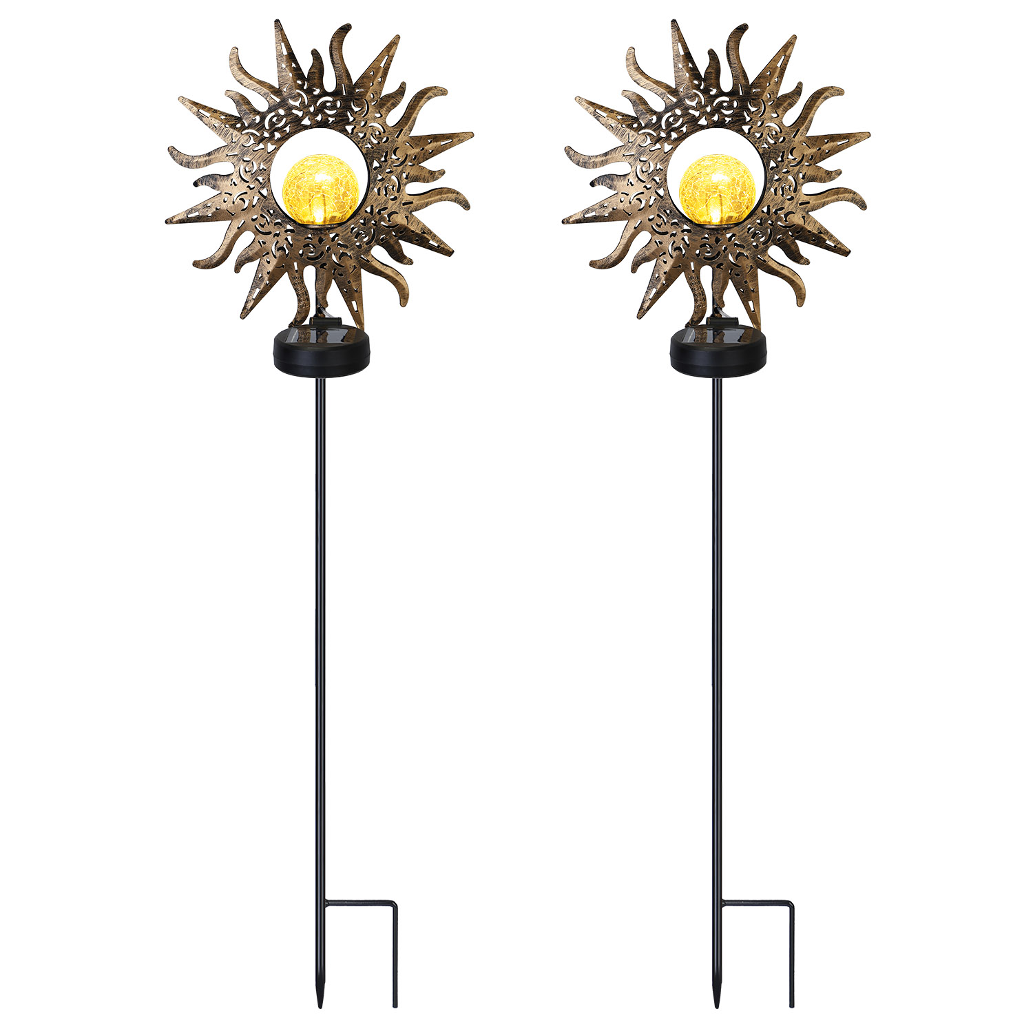 Unique sun shape design and warm white lighting effect create a beautiful and romantic atmosphere best for garden decorIP54 waterproof and weather resistant Great perform even on rainy day No wiring required and easy installation Come with high photoelectric conversion solar panels our lighthouse lamp automatically charges in daytime sunlight and lights up to 8Hrs in dark environments No electricity and money saving Ideal as solar yard lights solar patio lights solar driveway lights solar walkway lights and solar pathway light etc Decorative Sun Lamp This solar lights outdoor decorative with sun wrought iron and crack glass ball design emits warm white lighting effect and provides gorgeous pattern to create a romantic atmosphere Solar Powered Garden Lamp Come with high photoelectric conversion solar panels our lighthouse lamp automatically charges in daytime sunlight and lights up to 8Hrs in dark environments No electricity and money saving Easy Installation Just simply press the switch to ON position it owns easy installation no wiring required which is safe for indoor or outdoor use Nearly 90 rotatable solar panel enables our light to be fully charged the sunlight IP54 Waterproof Outdoor Lamp The LED lamp owns durable construction and weather resistant of the garden solar lights IP54 waterproof helps solar lights outdoor function well ensures long lasting performance under most weather conditions Wide Applications Enhance your garden or landscape day and night the solar outdoor light stake is ideal for any season in multiple places Take it and dress up your lawn patio garden pathway courtyard or outdoor Please turn on the switch when first time use and fully charged the light under direct sunlight about 6Hrs Brand Solarek Product Type 2Pcs Solar Powered Sun Decorative Stake Lamps Materials Iron Plastic Crackle Glass Solar Panel 2V100mah Crystalline Silicon Battery Rechargeable 12V800mAh AA NiMH Battery Work Time 8Hrs Fully Charged Time 6Hrs Color Temperature 3200K Warm White LED Bead 1Pc Per Lamp Waterproof IP54 Solar Panel Size 4x46cm157x181in Per Sun Light Assembled Size See Pictures Per Sun Light Assembled Weight 419g093lbs 2Pcs Package Size 27x28x18cm106x11x7in 2Pcs Package Weight 115kg253lbs 2Pcs x Sun Lamp Heads 2Pcs x h Shaped Stakes 2Pcs x I Shaped Tubes 1 x User Manual
