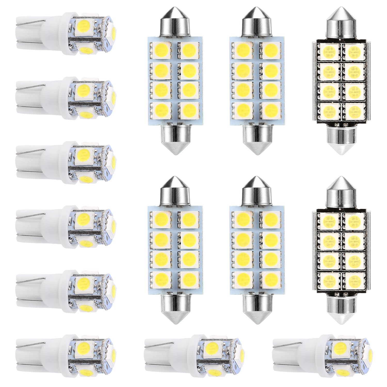 Do you want to say good bye to dim light environment and make your car interior brand new Our economical and powerful 14pcs festoon LED interior light kit will help you It comes with 2 types of LED light bulbs T10 5050 5LEDs bulb and 41mm 5050 8LEDs bulb to provide 60lumens and 96lumens brightness separately And combining premium LED chip with scientific circuit design it has a low power consumption to reach around 50000H lifespan Additionally it can directly replace the original T1041mm halogen bulb and widely installed on various types of 12V DC vehicles as dome light map light license plate light trunk light side positioning light etc Reliable Light Performance Coming with 2 types of LED light bulbs which separately adopt 5pcs 5050 LED chips to reach 60lumens and 6000K brightness and 8pcs 5050 LED chips to reach 96lumens and 6000K brightness Economical Festoon LED Interior Light Kit Including 14pcs festoon LED light bulbs 8pcs T10 5050 5LEDs bulbs 4pcs 41mm 5050 8LEDs bulbs and 2pcs 41mm 5050 8LEDs bulbs with decoder to snugly replace your original dim light bulbs and make your car interior brand new Energy Saving and Long Lifespan Combining premium LED chip with scientific circuit design our LED light bulb has a low power consumption and can reach up to 50000H lifespan Easy and DamageFree Installation Comes with original T1041mm bulb connecting interface and you can replace the original halogen bulb directly no cutting no splicing plug and play MultiPurpose and Wide Application Can be used as dome light map light license plate light trunk light side positioning light etc and widely installed on various types of 12V DC vehicles Product Type LED Interior Light KitMaterial Plastic AluminumSuitable Sockets T1041mmLED Type 5050LED Light Color White Lumens 60LM T10 5050 5LEDs 96LM 41mm 5050 8LEDsColor Temperature 6000KVoltage DC 12VLifespan 50000Hours Item Size As the Picture ShowItem Weight 28g0062lbsPackaging Size 11cm x 75cm x 2cm433in x 295in x 079in L x W x HPackaging Weight 32g0071lbs8 x T10 5050 5LEDs Bulbs 4 x 41mm 5050 8LEDs Bulbs 2 x 41mm 5050 8LEDs Bulbs with Decoder1 x User Manual