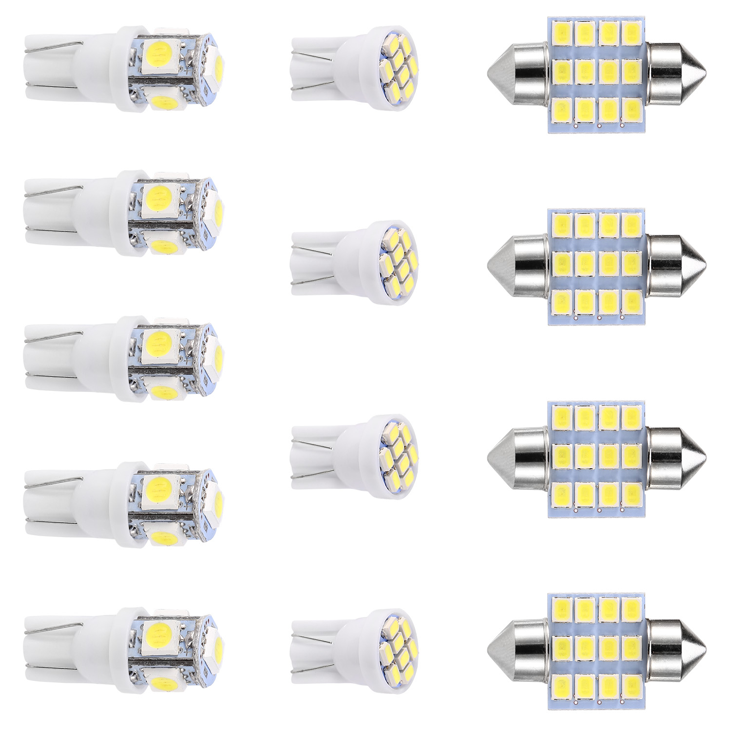 Do you want to say good bye to dim light environment and make your car interior brand new Our economical and powerful 13pcs festoon LED interior light kit will help you It comes with 3 types of LED light bulbs T10 5050 5LEDs bulb T10 1206 8LEDs bulb and 31mm 2835 12LEDs bulb to provide 60lumens 56lumens and 84lumens separately And combining premium LED chip with scientific circuit design it has a low power consumption to reach around 50000H lifespan Additionally it can directly replace the original T1031mm halogen bulb and widely installed on various types of 12V DC vehicles as dome light map light license plate light trunk light side positioning light etc Reliable Light Performance Coming with 3 types of LED light bulbs which separately adopt 5pcs 5050 LED chips to reach 60lumens and 6000K brightness 8pcs 1206 LED chips to reach 56lumens and 6000K brightness and 12pcs 2835 LED chips to reach 84lumens and 6000K brightness Economical Festoon LED Interior Light Kit Including total 13pcs festoon LED light bulbs 5pcs T10 5050 5LEDs bulbs 4pcs T101206 8LEDs bulbs and 4pcs 31mm 2835 12LEDs bulbs to snugly replace your original dim light bulbs and make your car interior brand new Energy Saving and Long Lifespan Combining premium LED chip with scientific circuit design our LED light bulb has a low power consumption and can reach up to 50000H lifespan Easy and DamageFree Installation Comes with original T1031mm halogen bulb connecting interface you can replace the original halogen bulb directly no cutting no splicing plug and play MultiPurpose and Wide Application Can be used as dome light map light license plate light trunk light side positioning light etc and widely installed on various types of 12V DC vehicles Brand Fresh Fab FindsProduct Type LED Interior Light KitMaterial PlasticSuitable Sockets T1031mmLED Type 505012062835LED Light Color White Lumens 60LM T10 5050 5LEDs 56LM T10 1206 8LEDs 84LM 31mm 2835 12LEDsColor Temperature 6000KVoltage DC 12VLifespan 50000Hours Item Size As the Picture ShowItem Weight 16g0036lbs Packaging Size 11cm x 75cm x 1cm433in x 295in x 039in L x W x HPackaging Weight 19g0042lbs5 x T10 5050 5LEDs Bulbs 4 x T10 1206 8LEDs Bulbs4 x 31mm 2835 12LEDs Bulbs1 x User Manual