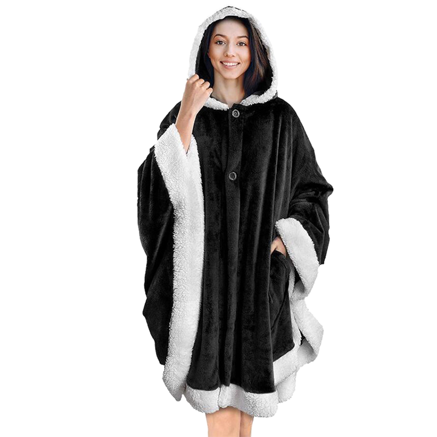 Hoodie Blanket Wrap Wearable Hoodie Snuggle Robe Sweatshirt Soft Lined Cuddle Poncho Cape w/ Hat 2 Pockets Buttons-Black