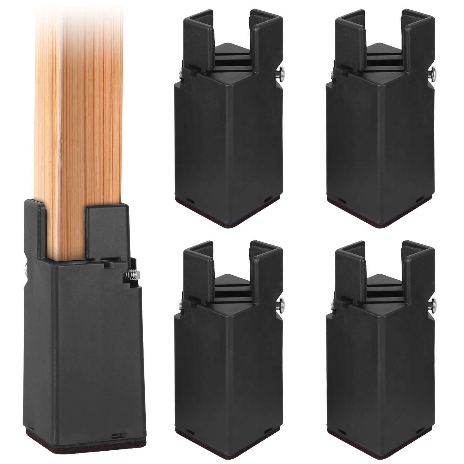 If you feel like your bed frame is too low and it gets in the way of morning productivity this set of risers is a safe quick and efficient way to solve this issue Made of heavy duty POM material the risers are tough and durable enough to handle most types of different furniture with a total weight capacity up to 2204lbs Besides its also great for adding storage space under your furniture and allows for easy vacuum cleaning Sturdy Material Made of heavy duty POM the risers are tough and durable enough to withstand the heaviest furniture at your home with a total weight capacity up to 2204lbs Moreover felt bottom also allows you to move and slide heavy furniture with ease No Falling Off Compared with those risers that are easy to fall off our risers feature adjustable screw clamp fixture and 12in groove sinking which ensures a snug fit and avoids tilting when moved or lifted These risers will always remain intact by wrapping the furniture legs securely Adjustable Width Fit for round or square legs with a diameter between 1in and 2in Increased height 4in Heightened groove protection 12in Warm Tips Not for bent or recliner chairs only for right angle chairs Create More Space Adding additional height not only creates more storage space but also allows vacuum cleaners to do a more thorough cleaning You can apply the risers to bed couch armchair table and sofa to reduce shoulder pain or neck pain caused by low height of furniture Protect Your Floor High density felt bottom can protect your floor from scratches Besides the smooth edges will not cause any crack or dent on hardwood or other hard surfaces Easy To Install With no extra tools required all you need to do is to use the screwdriverincluded to adjust the screw for a perfect fit Super easy to operate for seniors Brand Fresh Fab Finds Product Type Bed Riser Quantity 4Pcs Color Black Material POM Total Weight Capacity 2204lbs Per Riser Size 1345555cm532222in Per Riser Weight 154g034lbs Package Size 1215125cm475949in Package Weight 748g165lbs 4PcsRisers 1Screwdriver 1User Manual